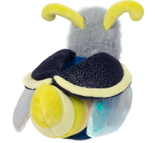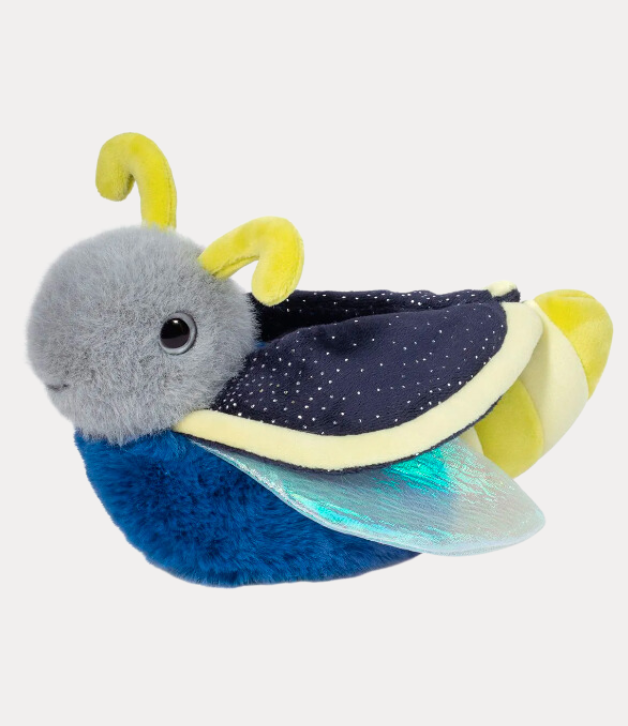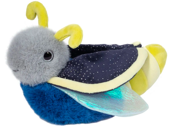 A summer’s night wouldn’t be complete without the magic of little glowing lights filling the air! Our Firefly stuffed animal, Flint, adds his own spark to the evening! Flint’s tail features alternating bands of yellow to represent the famous glowing abdomen of the Lightning Bug. Richly colored navy blue plush materials make up the rest of his body, while special fabrics bring intrigue to his wings. These have been depicted with graceful transparent materials that boast an iridescent shine. Gold speckles patterning Flint’s wing covers will catch your eye and bring to mind a star filled night. Throw your cares away and let Flint the plush Firefly magic you away on an evening of wonder and enchantment!