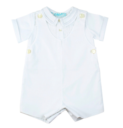 A must have for every little boy! This classy and elegant bobby suit will make your loved one look and feel special. The eye-catching shirt features ric rac inserts on the collar, and rows of boring with dainty hand embroidery going down the front. Sweet mother of pearl buttons hold the solid white overalls in place on this pure, vintage looking set. Perfect for special occasions, religious events, and holiday wear. The Feltman Brothers Dressy Shortall - sure to become a family heirloom for generations.