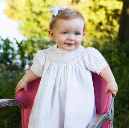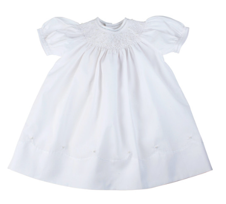 Everyday occasions made special, and special occasions made even better! In this beautiful bishop dress, your little girl is sure to shine. The Pearl Flower Bishop Dress features dainty fagoting lining the neck and puffed sleeves, along with a beautifully detailed smocked yoke. The smocking is embellished with exquisite hand embroidery - a diamond overlay and sweet floral bullions with pearls in the center. Matching flowers adorn the hem, just above a soft scallop shaped feather stitch. A vintage style baby dress, perfect for Easter, everyday spring wear, or Baby's first portrait. Another Feltman Brothers classic - sure to become a treasured family heirloom for generations!