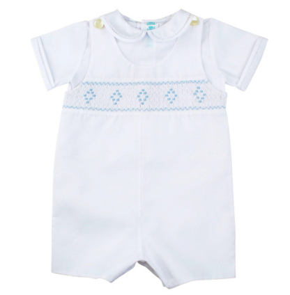 Your little boy will look as handsome as can be in this adorable and classy shortall! The shirt of this two piece outfit features dainty fagoting along the peter pan collar and sleeve cuffs. Above the shirt are classy white overalls with smocking on the front, embellished with hand made white and blue embroidery. Two decorative buttons fasten the overalls into place. Traditional, heirloom style that transcends generations!