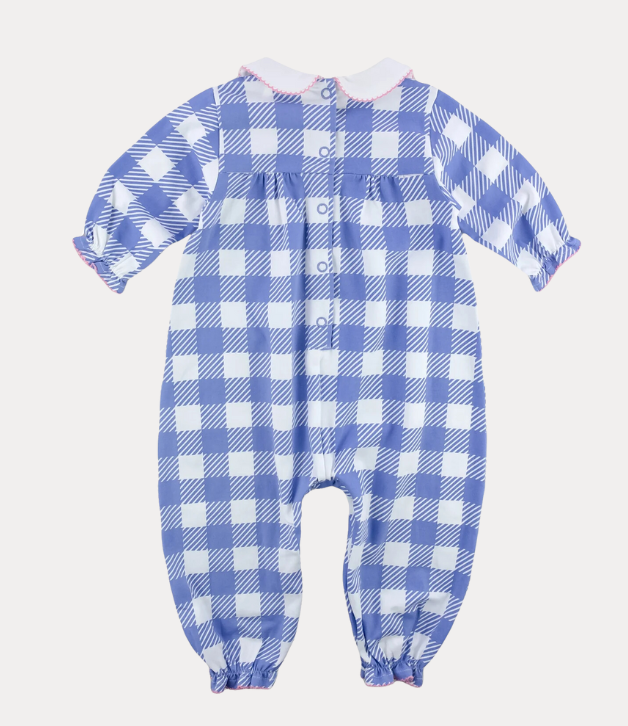 - Florence Eiseman designed blue and white buffalo plaid printed jersey knit