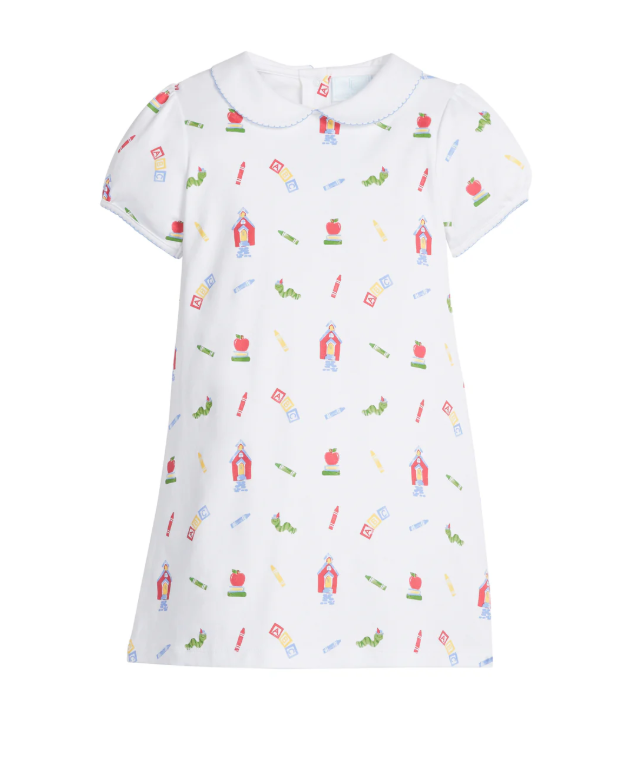 Head back to school in comfort and style! Our new Printed Peter Pan Dress - School Days features short sleeves and a peter pan collar trimmed in light blue picot. With an adorable school-inspired print and made from 100% pima cotton, your little girl can learn and play all day!