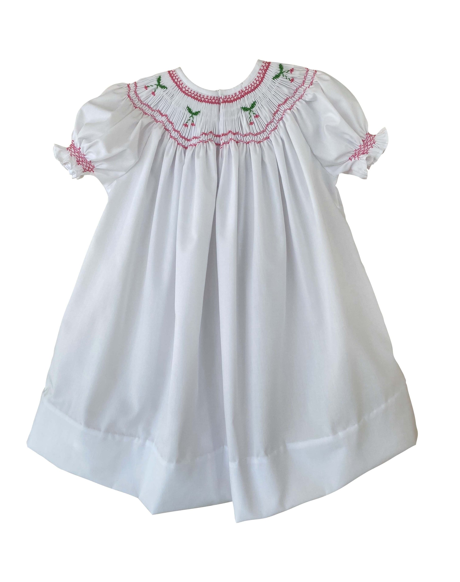 - Dress with hand smocked neckline, puff sleeves and snap closures in the back