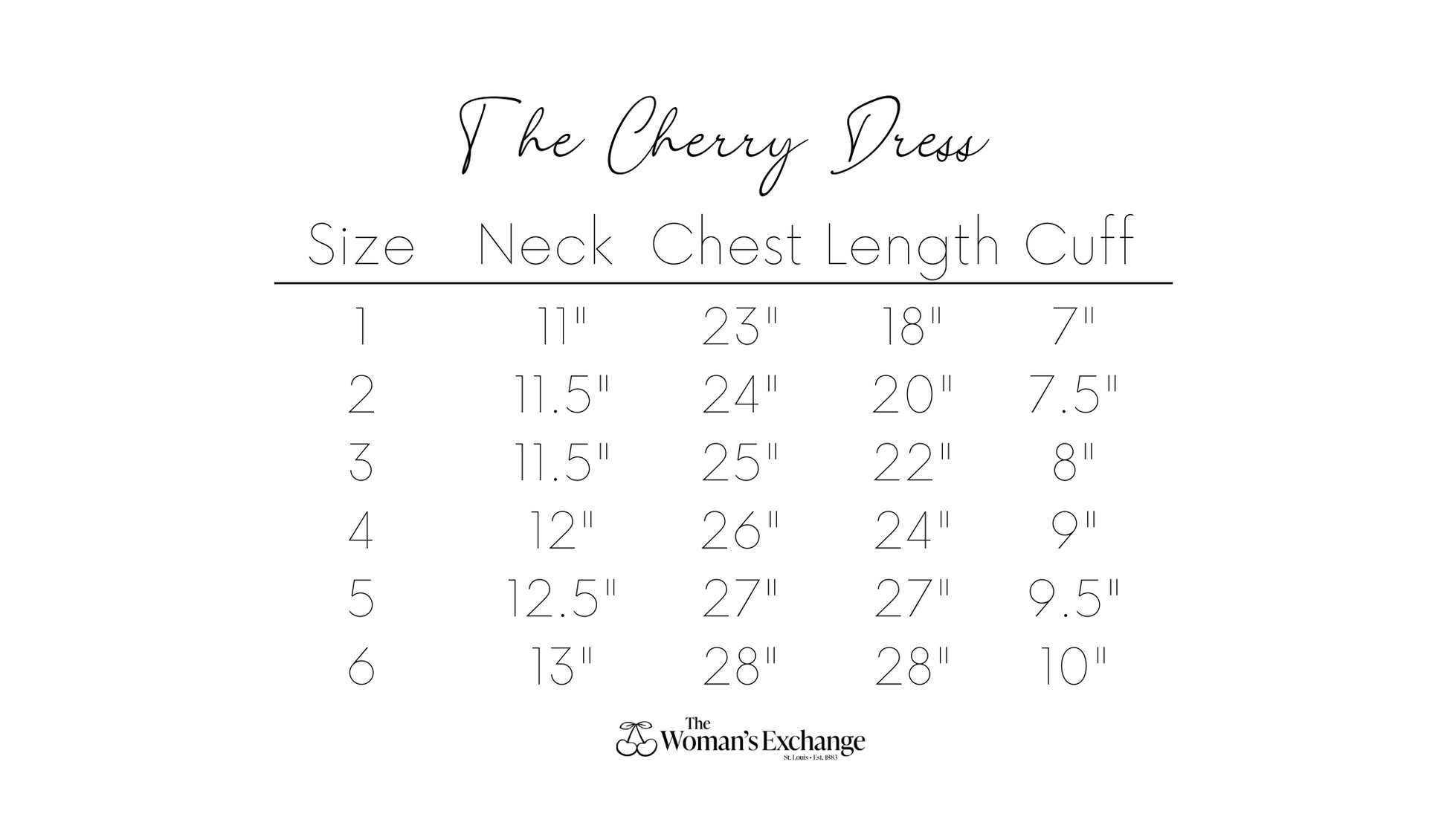 Care: Machine wash cold on delicate cycle. Do not soak. Use only mild detergents and do not use bleach or Woolite. Hang immediately and air dry only. Low iron when needed. A fun twist on our classic Cherry Dress that was introduced in 1954. The Cherry Dress is sold exclusively at the Woman’s Exchange of St. Louis. This iconic, handmade dress has charmed mothers for decades, ranging from Jacqueline Kennedy Onassis, Gwenyth Paltrow, Jenna Bush, and other social media influencers. The Cherry Dress was trademarked in 2016 and has been featured in the New York Times Style section. Find out more about our history and our artisans here.